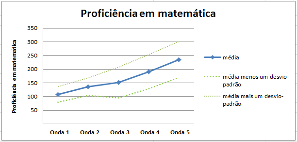 No primeiro gráfico está calculada a média em cada ano de medição. Podemos tomar dois destes momentos: ano 1 e ano 4. O ano 1 tem duas medições, uma de controle ao início do ano na entrada do aluno (1a. série) e outra ao final do mesmo ano. É óbvio que no ano 4 os estudantes estão com médias mais altas em matemática. Todos, em média, estão aprendendo. Mas qual é a estrutura interna desta evolução?