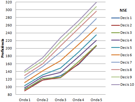 No segundo gráfico, abaixo, pode-se ver esta estrutura interna. Os mesmos dados do gráfico anterior são mostrados por decis de NSE. Note-se como o segundo dá mais informações do que o primeiro. Note-se que os alunos que chegaram no ano 1 com menor capital cultural e social (NSE), somente avançam até o ano 4 dentro de uma “trilha” específica. O avanço no desempenho ganha aspecto relacional e associado ao valor de entrada obtido pelo aluno. Todos avançam, mas há uma proporcionalidade no avanço que se remete ao seu momento de entrada na escola. Isso pode ser feito porque havia controle da entrada da chegada do aluno na escola e um acompanhamento do painel de alunos ao longo de quatro anos (Projeto Geres), permitindo o cálculo de valor agregado. O aluno era o mesmo. Mediu-se também o nível socioeconômico destas crianças com dados obtidos diretamente junto à família, com os pais.