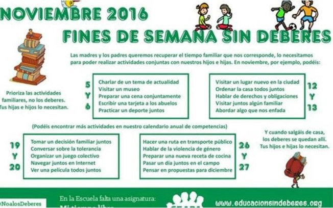 A “Confederación Española de Asociaciones de Padres y Madres del Alumnado” dirige um movimento muito interessante que foi divulgado pela BBC e visa lutar pelo direito das crianças terem mais tempo livre em casa (veja aqui). Eles exigem que o mês de novembro seja sem deveres de casa e por isso conclamam a uma “greve dos deveres de casa” neste mês, para que as crianças possam ter mais tempo livre.